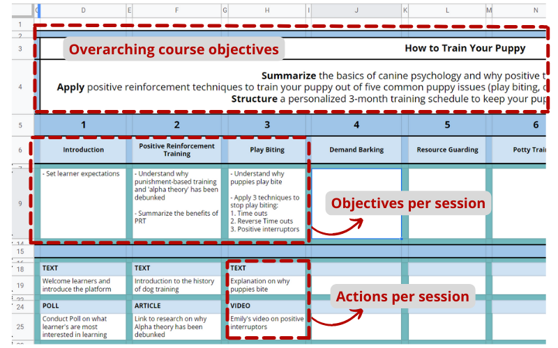 Now that you know the direction of your course, you can visualize the goals into clear learning objectives by storyboarding your lessons and selecting appropriate media formats (e.g., videos, activities, articles, etc.)