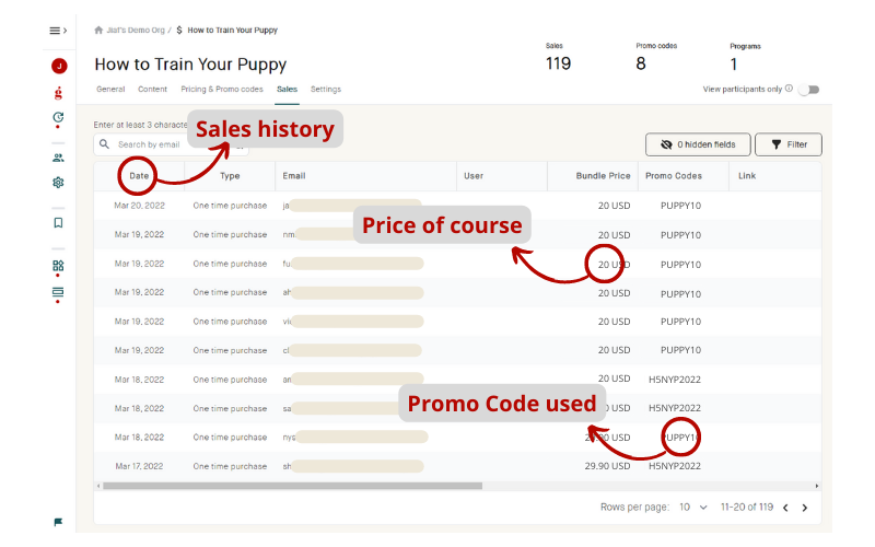 While Gnowbe Dashboard gives you information on what learners thought about the content of your course, the GnowbeShop Sales page gives you data on what price points and promotions worked well. By tracking your sales history, you can understand patterns and adjust your marketing plans accordingly.