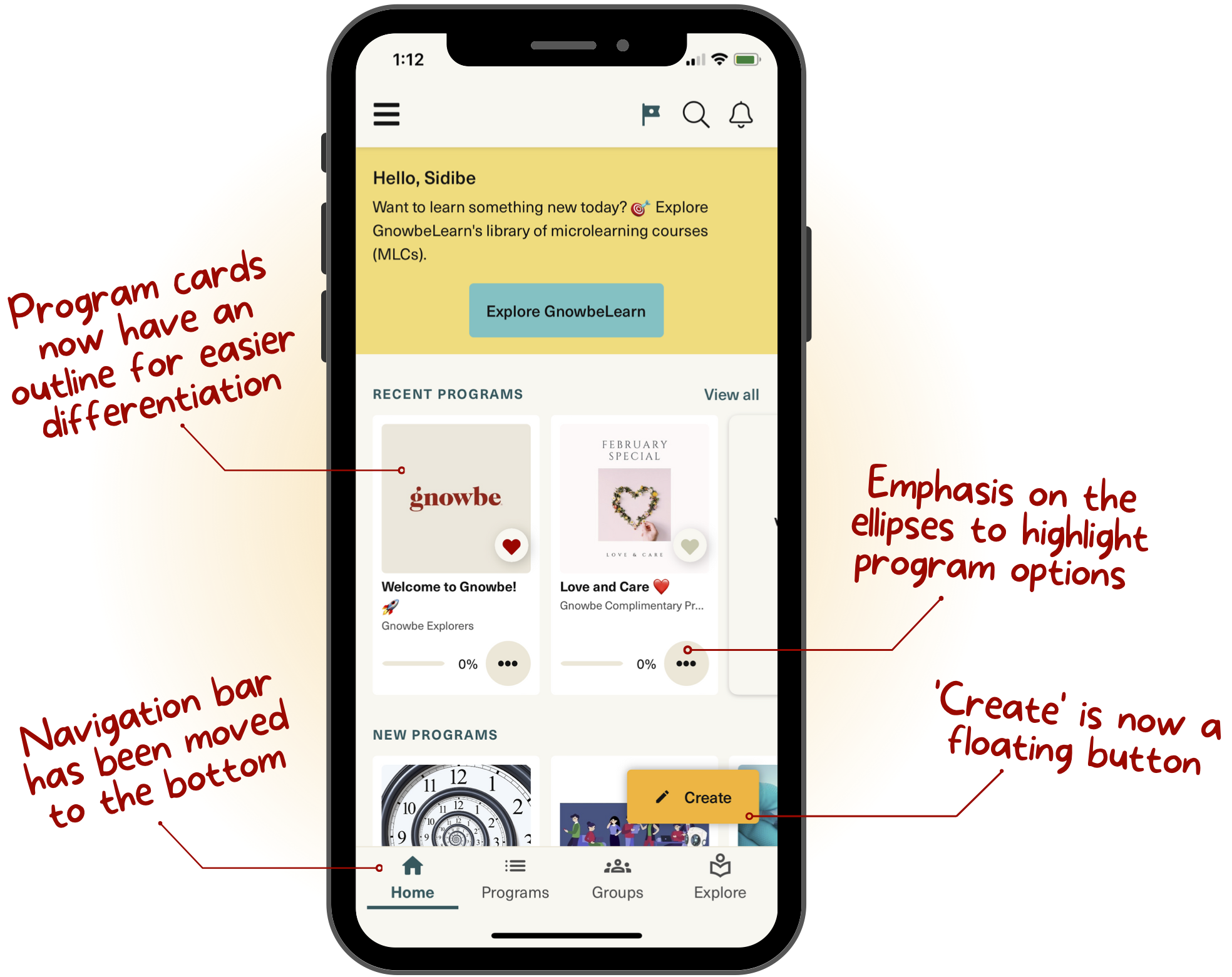 For those who have not updated their Android or iOS Gnowbe app recently, do so quickly to check out the sleek improvements we have made to our app home screen! We made these refinements to provide our users with a clearer navigation experience when learning and creating on Gnowbe App. The changes include: