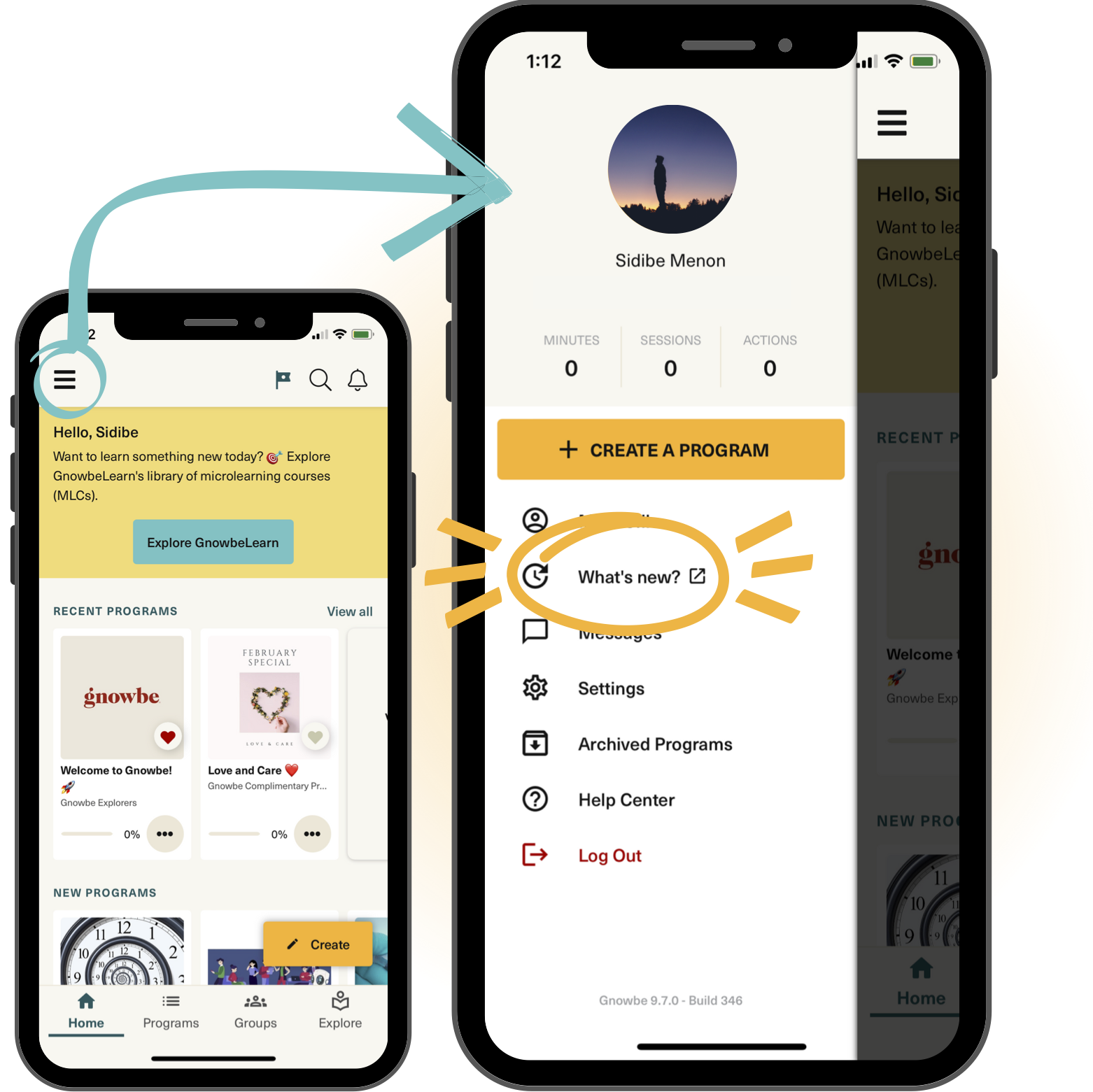 - On Gnowbe App, click the hamburger icon at the top left corner of your screen to find our newly minted What’s New? section. Click it to open our product feature updates webpage, where you can browse through our latest product developments.